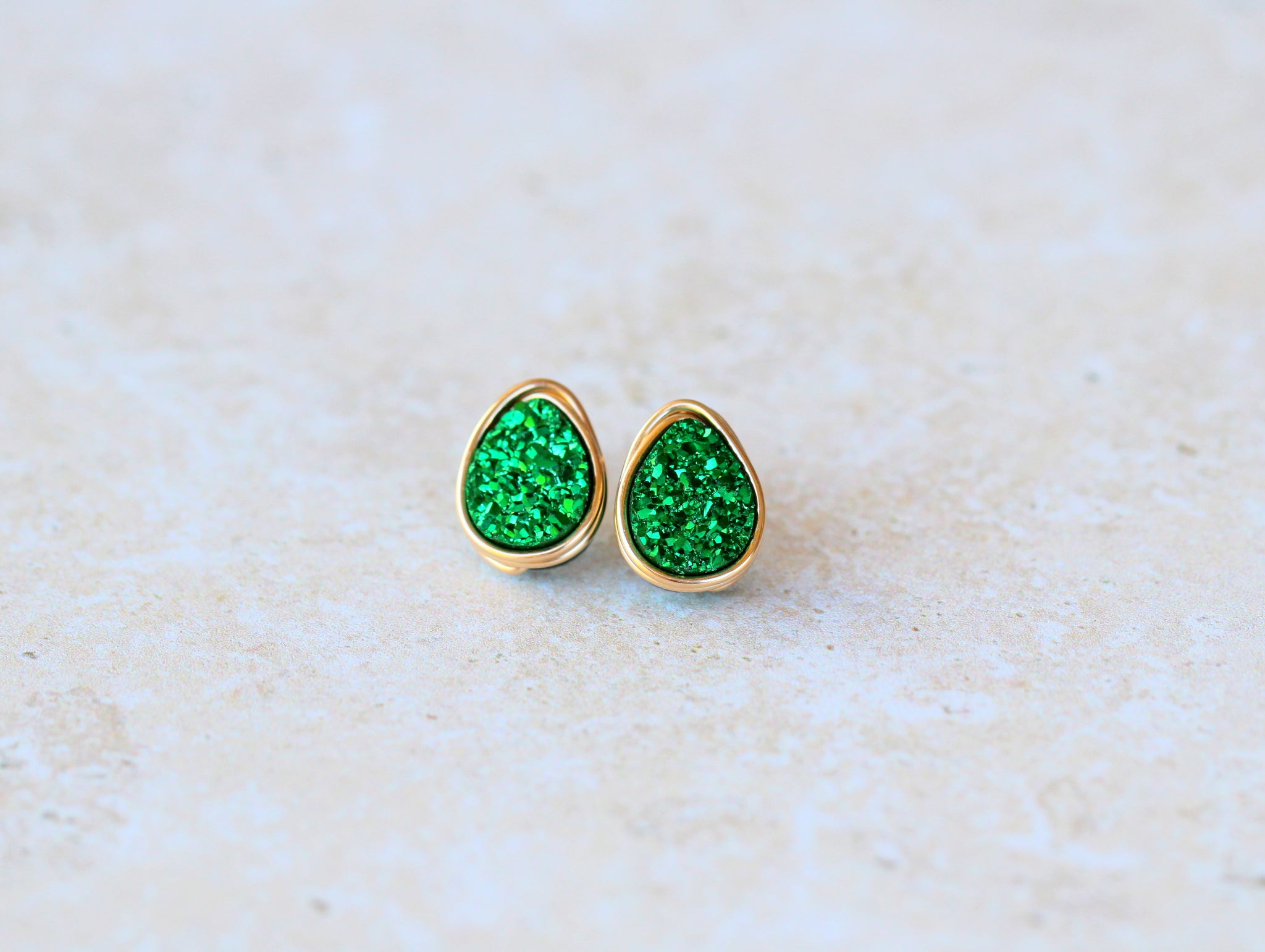 Petite Druzy Quartz teardrops in a shimmery vibrant green titanium finish are wrapped in 14k...