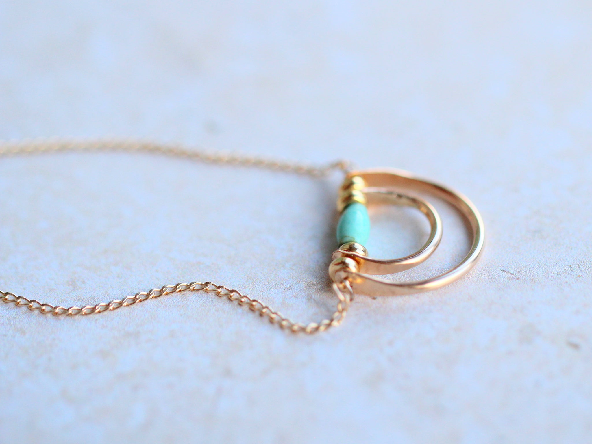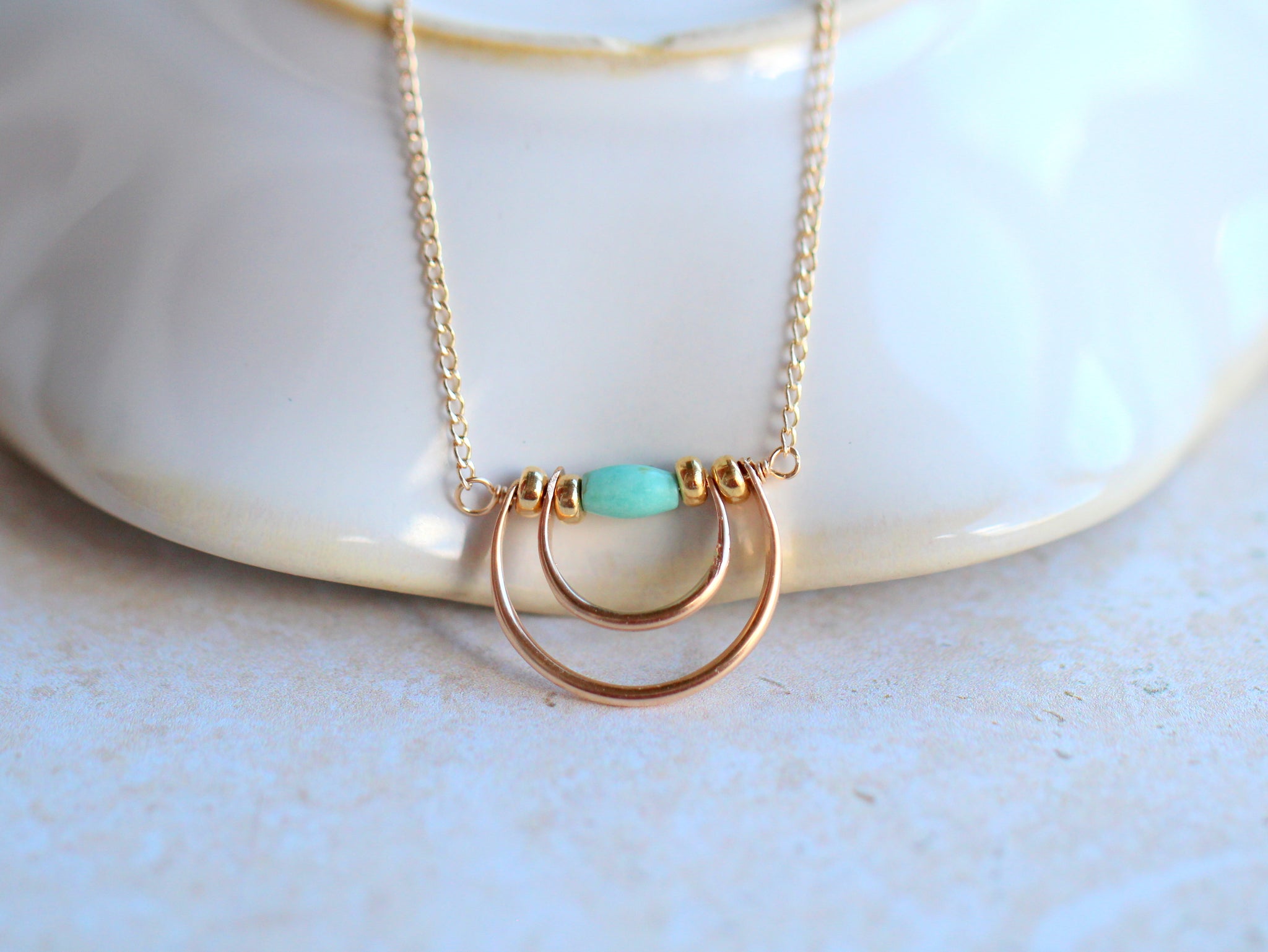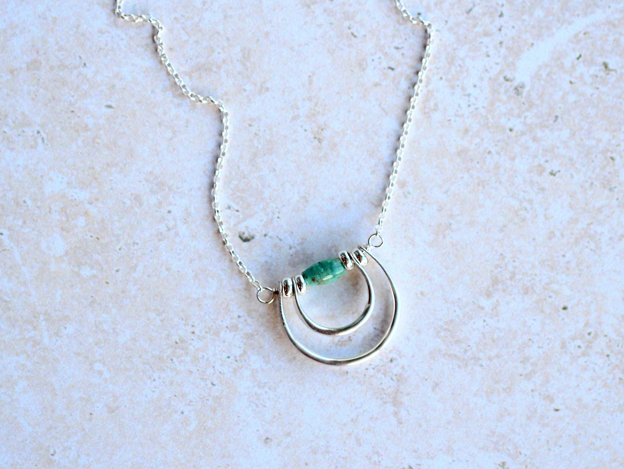 Hand formed and nested arches encircle a beautiful genuine turquoise stone, creating a pendant that...